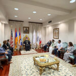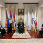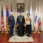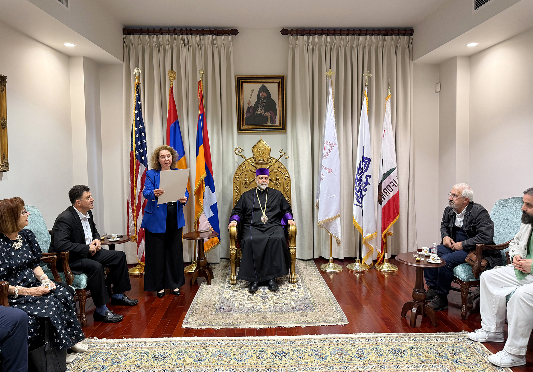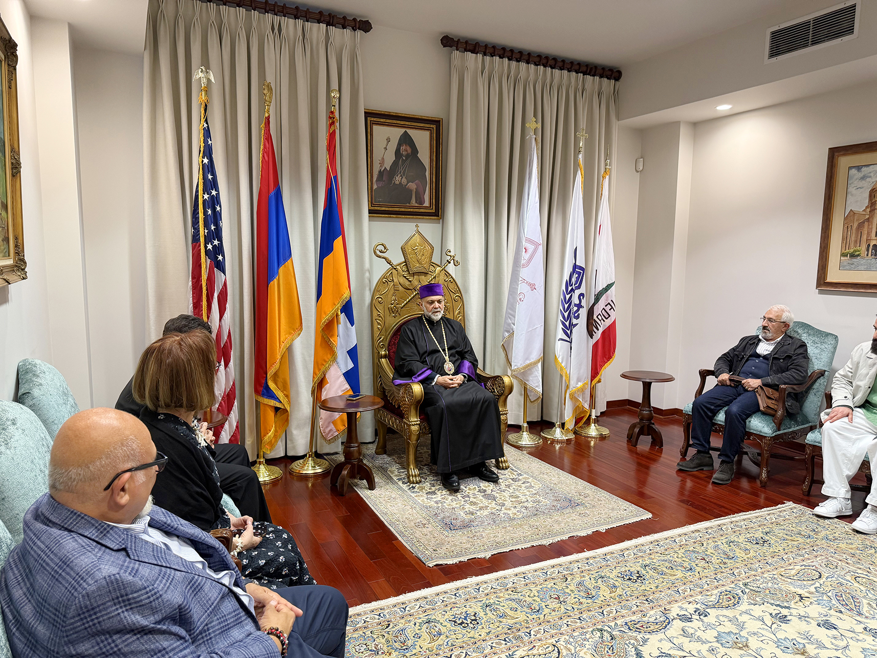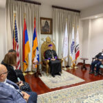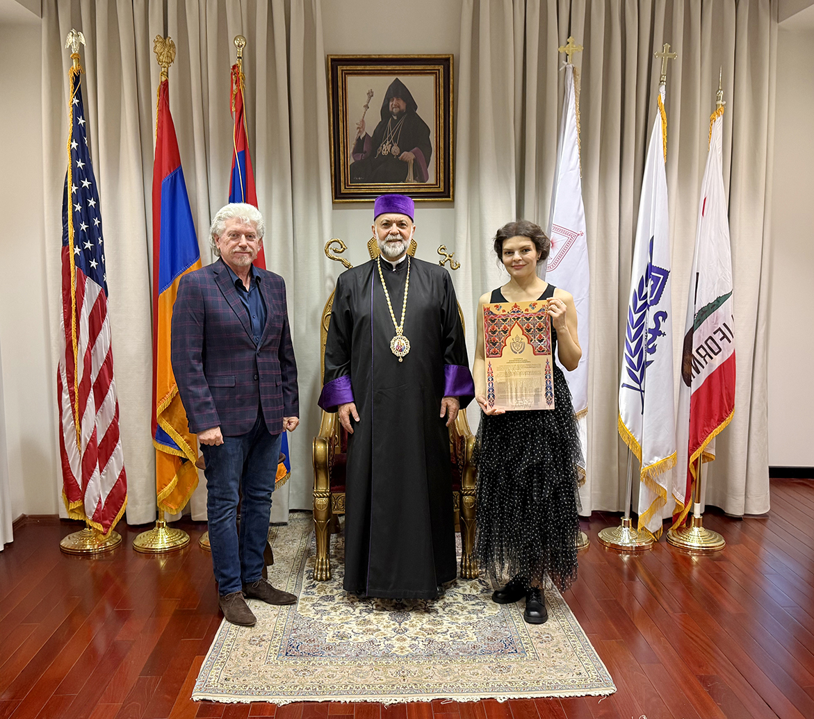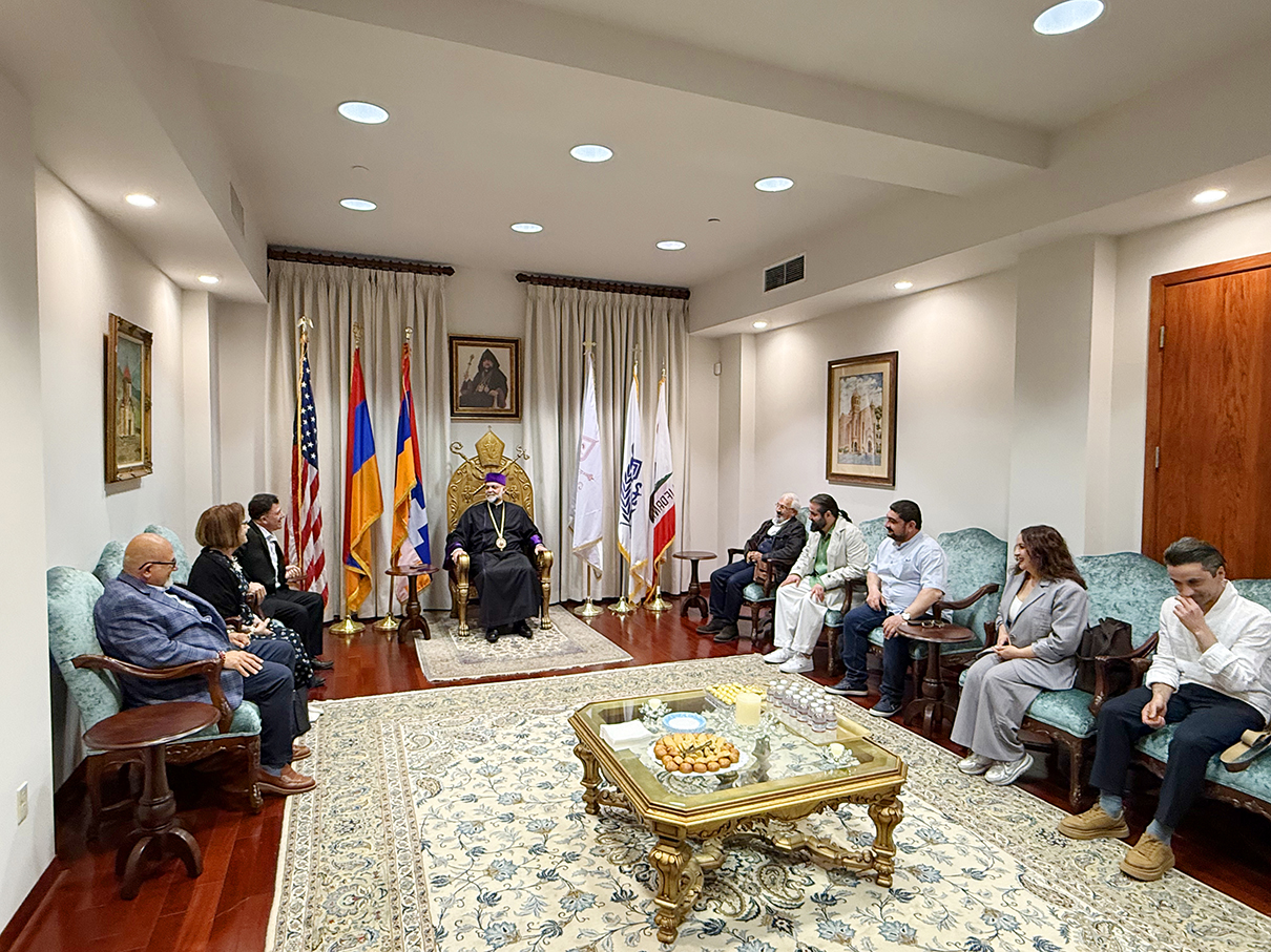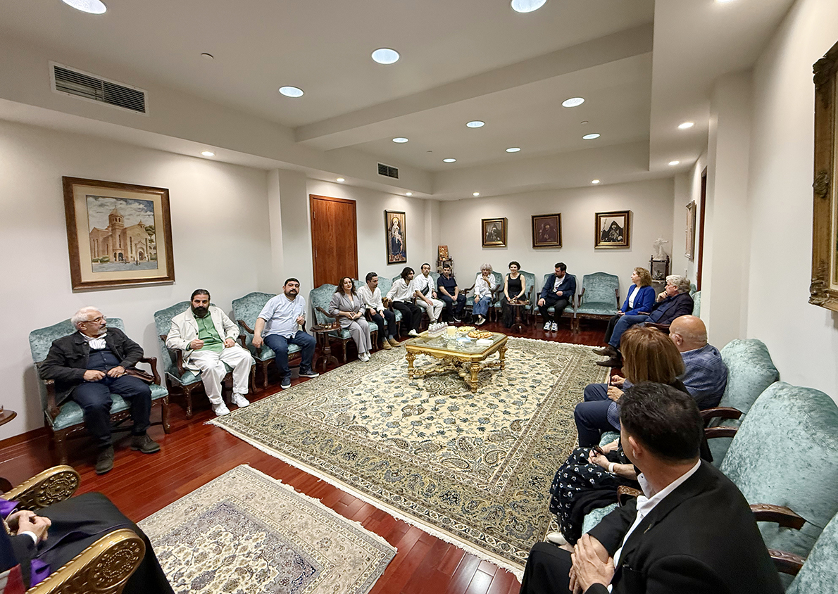 Ուրբաթ, 3 Ապրիլ 2026-ի առաւօտեան, Արեւմտեան Թեմի Առաջնորդ՝ Գերշ. Տ. Գեղամ Ս. Արք. Խաչերեան, Ազգ. Առաջնորդարանի մէջ ընդունեց այցելութիւնը Հայաստանի Սօս Սարգսեանի անուան Համազգայինի թատերախումբին, որ ներկայիս Լոս Անճելըս կը գտնուի՝ թատերական չորս գործեր ներկայացնելու ծրագիրով, գլխաւորութեամբ գեղարուեստական ղեկավար եւ բեմադրիչ Տիկին Նարինէ Գրիգորեանի, հիւրընկալութեամբ Արեւմտեան Ամերիկայի շրջանի Համազգայինի Շրջանային վարչութեան: Թատերախումբին մաս կը կազմէ նաեւ հայրենի դերասան եւ բեմադրիչ Դաւիթ Յակոբեան:
