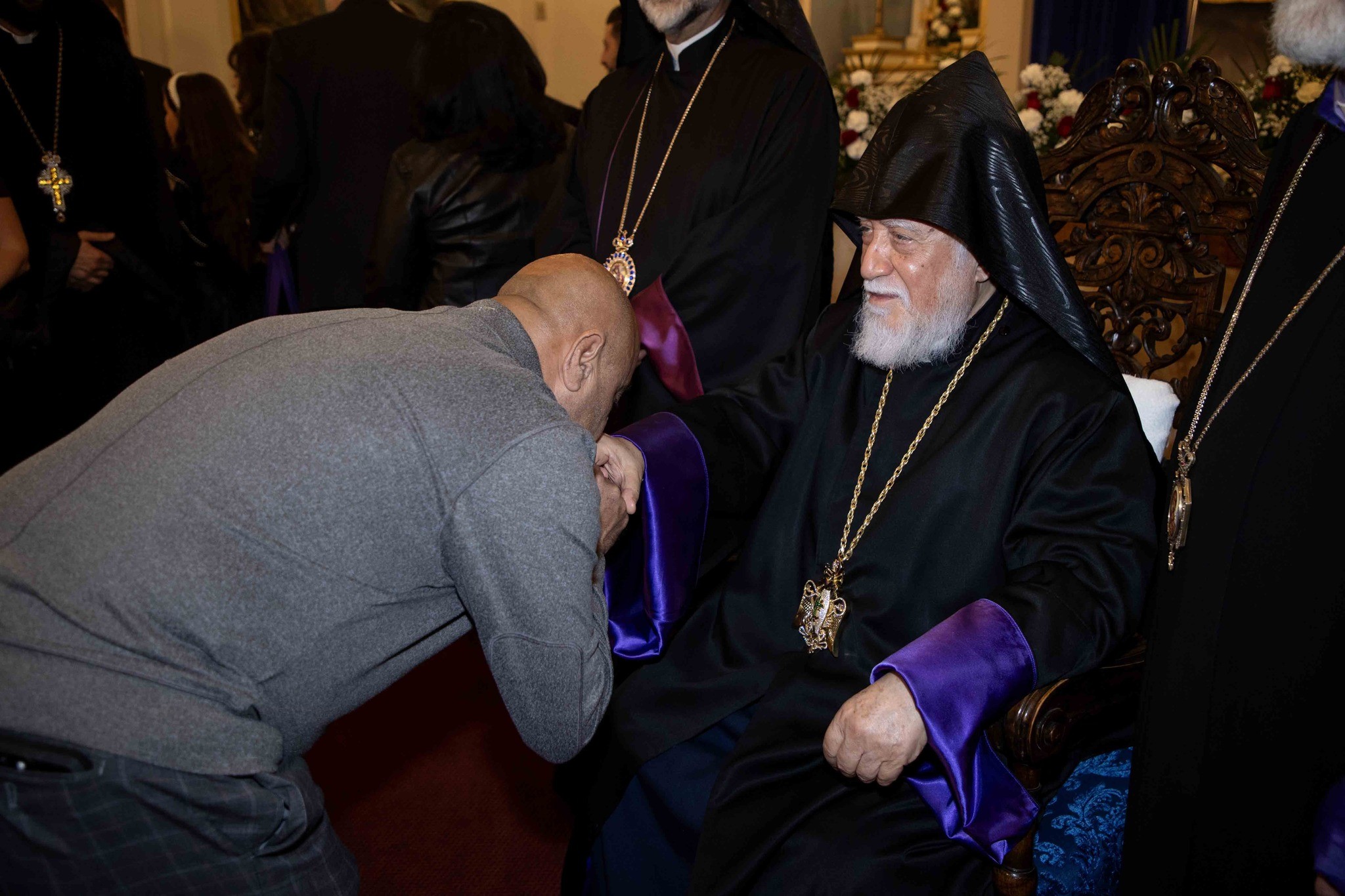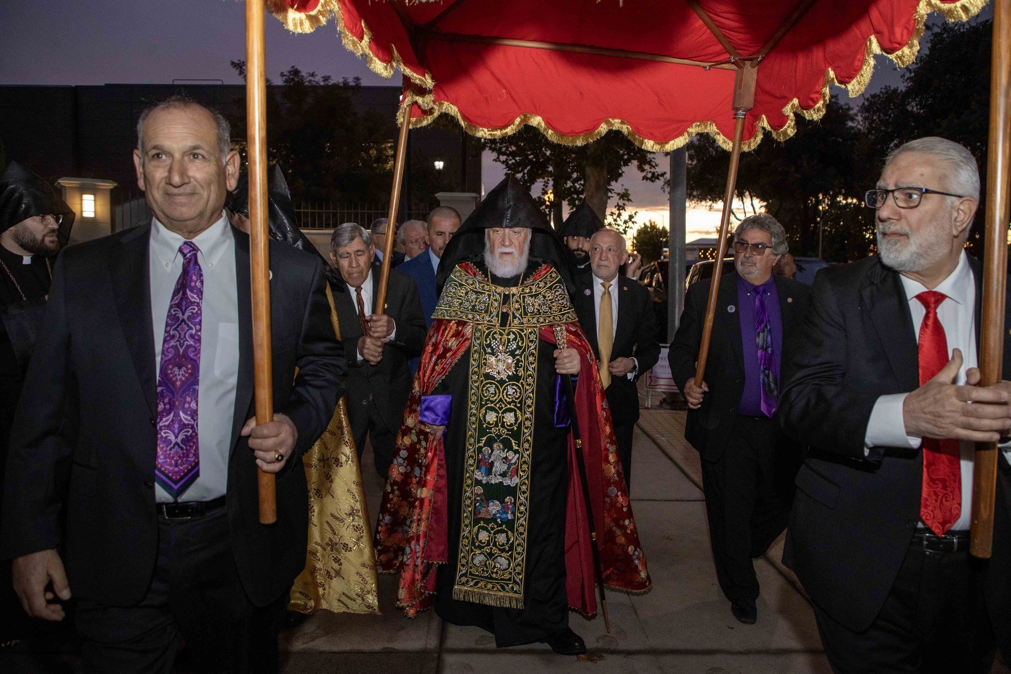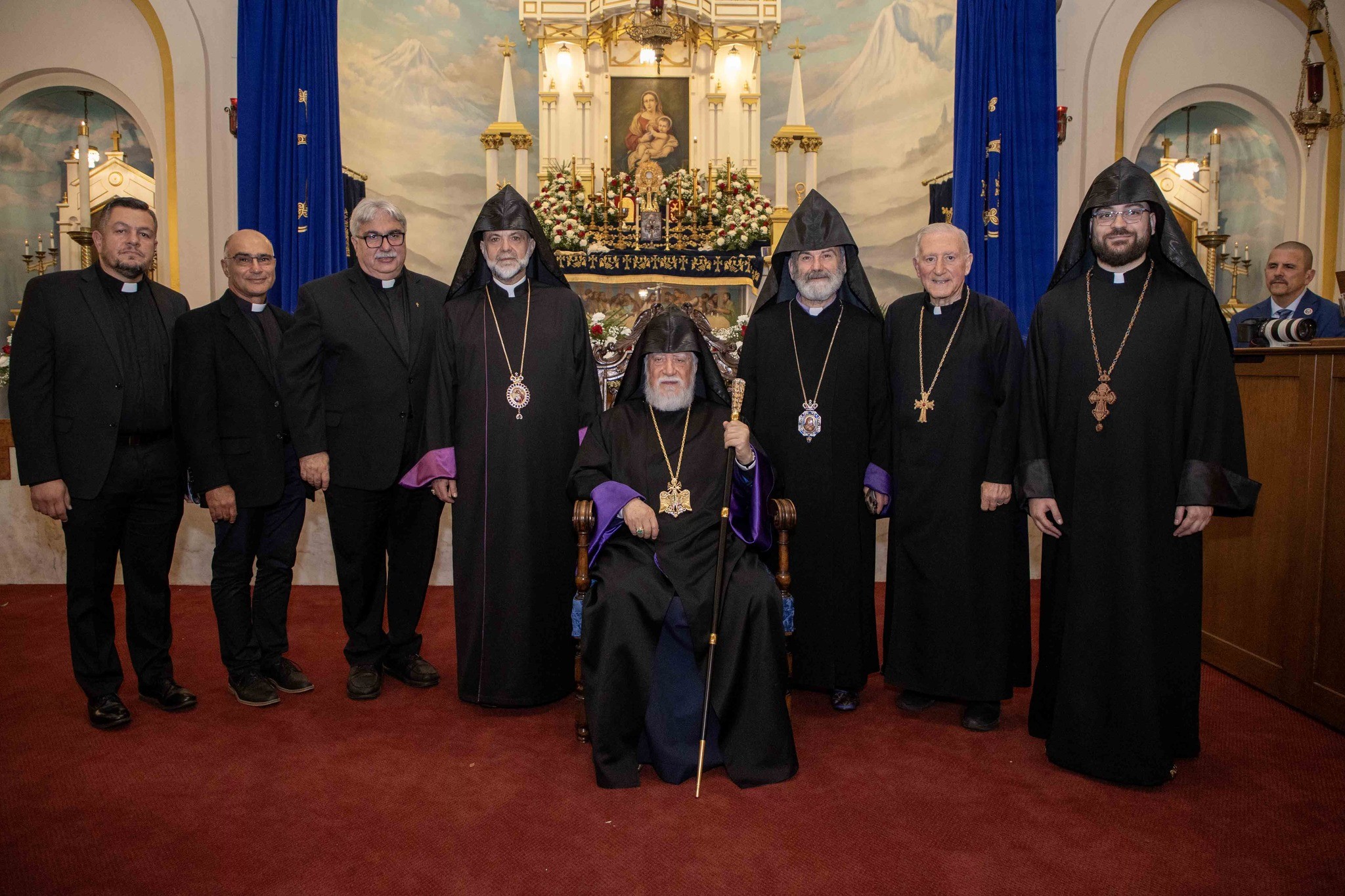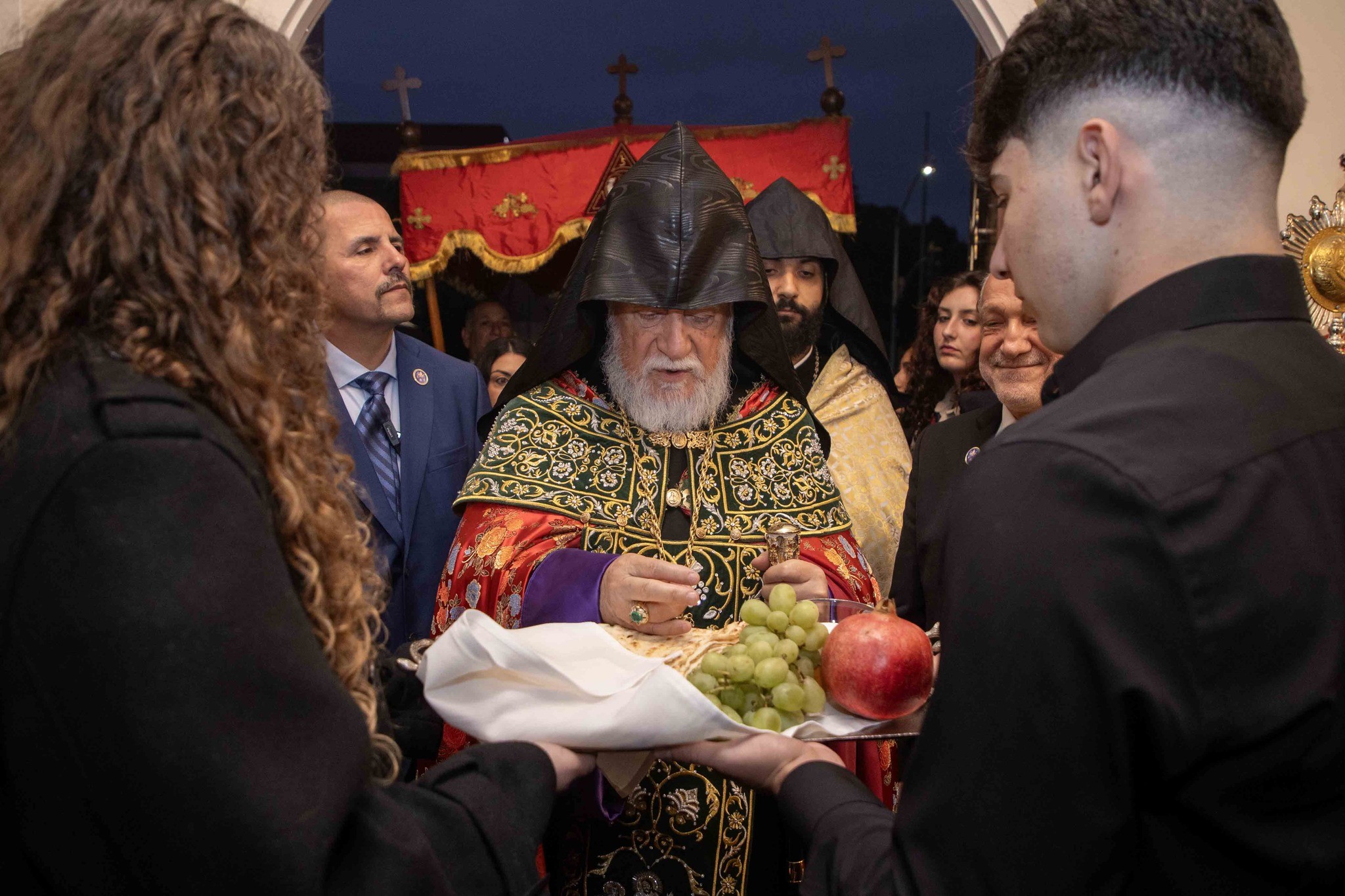 Արդարեւ, եկեղեցւոյ մուտքին, Նորին Սրբութիւնը եւ իր պատուիրակութիւնը դիմաւորուեցան առաջնորդ սրբազան հօր՝ Գեղամ Արք. Խաչերեանի, եկեղեցւոյ հոգեւոր հովիւին՝ Աշոտ Վրդ. Խաչատուրեանի, հոգաբարձութեան, յարակից մարմիններու եւ Ֆրեզնոյի մէջ կայք հաստատած հայորդիներու կողմէ: