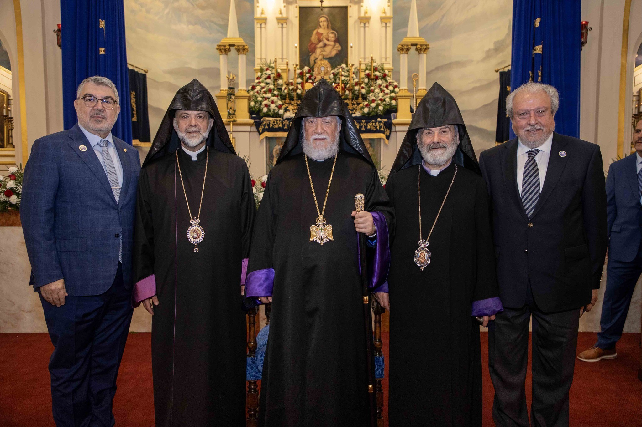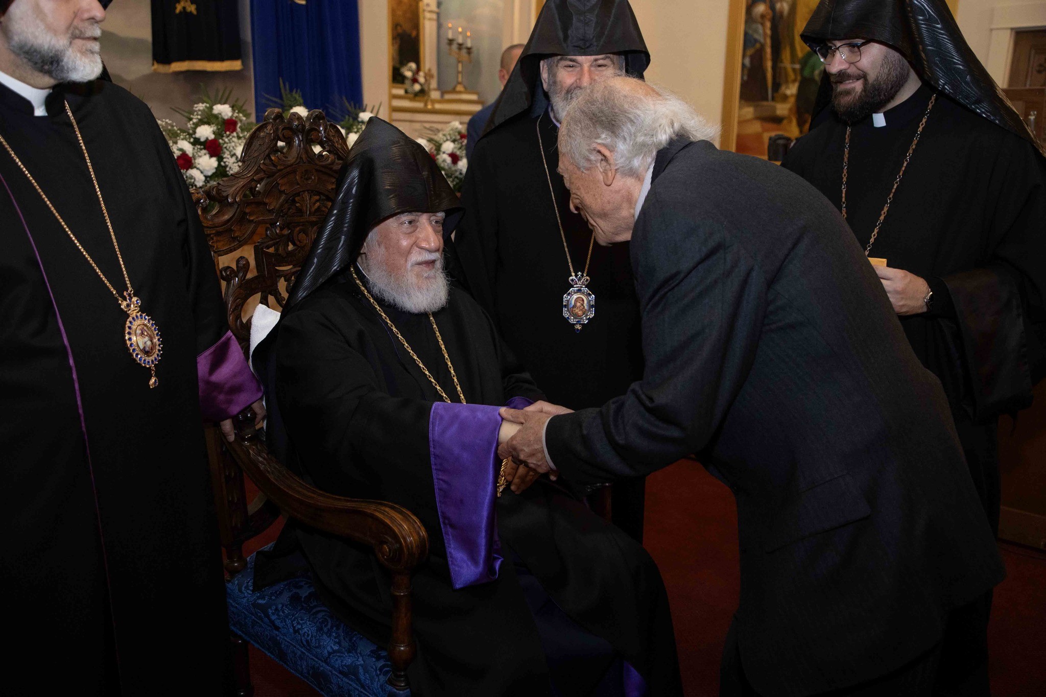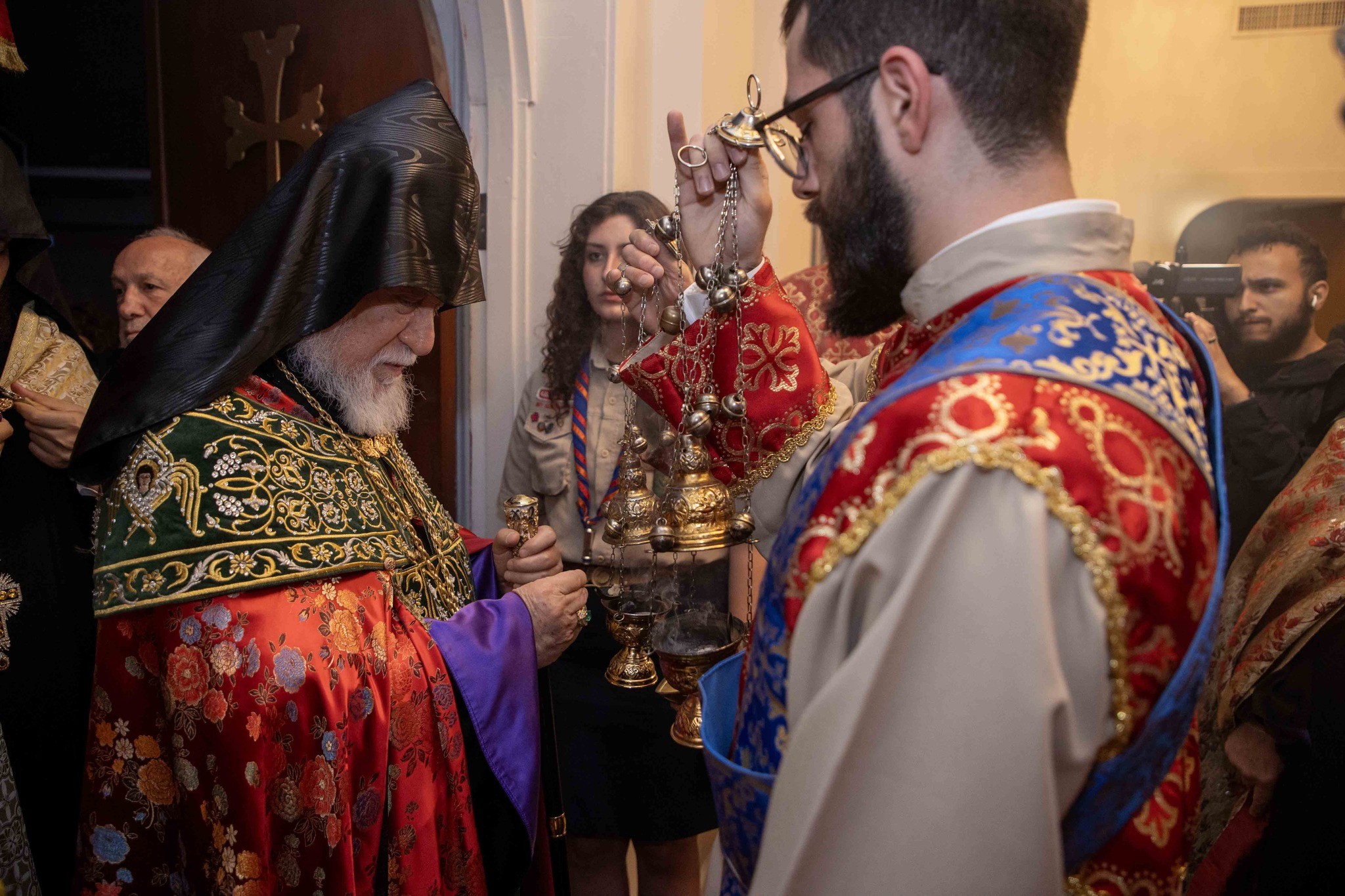 Արդարեւ, եկեղեցւոյ մուտքին, Նորին Սրբութիւնը եւ իր պատուիրակութիւնը դիմաւորուեցան առաջնորդ սրբազան հօր՝ Գեղամ Արք. Խաչերեանի, եկեղեցւոյ հոգեւոր հովիւին՝ Աշոտ Վրդ. Խաչատուրեանի, հոգաբարձութեան, յարակից մարմիններու եւ Ֆրեզնոյի մէջ կայք հաստատած հայորդիներու կողմէ:
