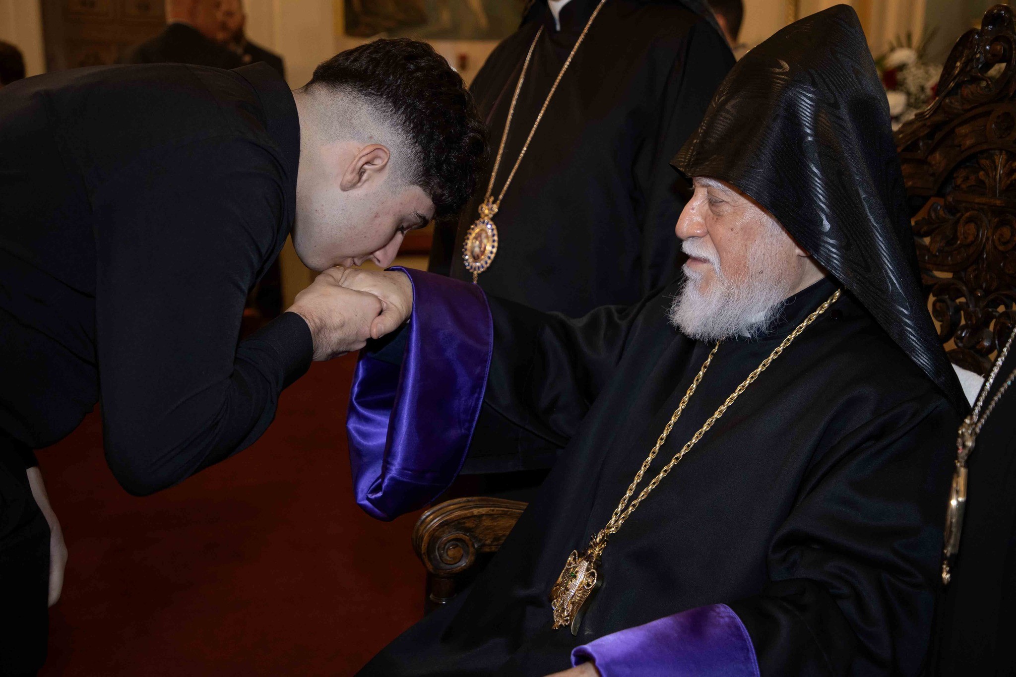 Վեհափառ Հայրապետի պատգամէն ետք տեղի ունեցաւ աջահամբոյր: Ֆրեզնոյի գաղութի զաւակները մէկ առ մէկ մօտենալով Նորին Սրբութեան՝ ստացան անոր օրհնութիւնը: