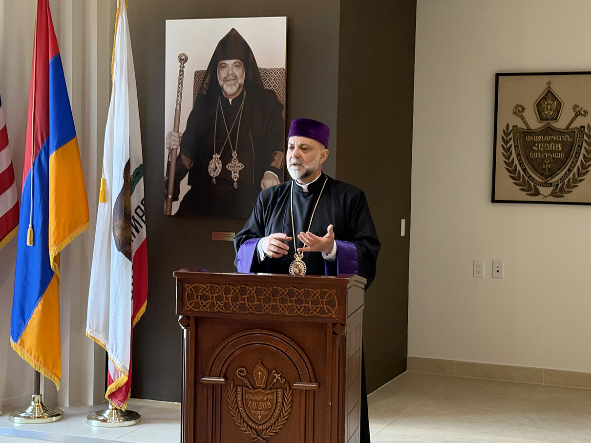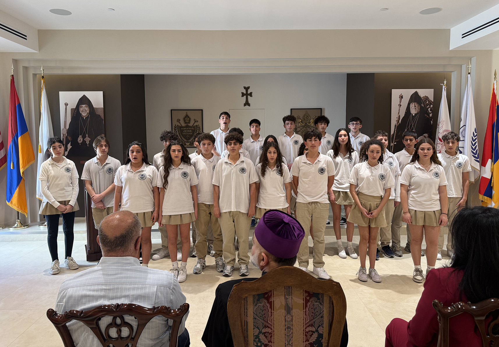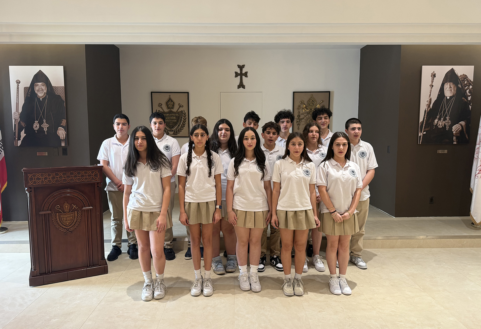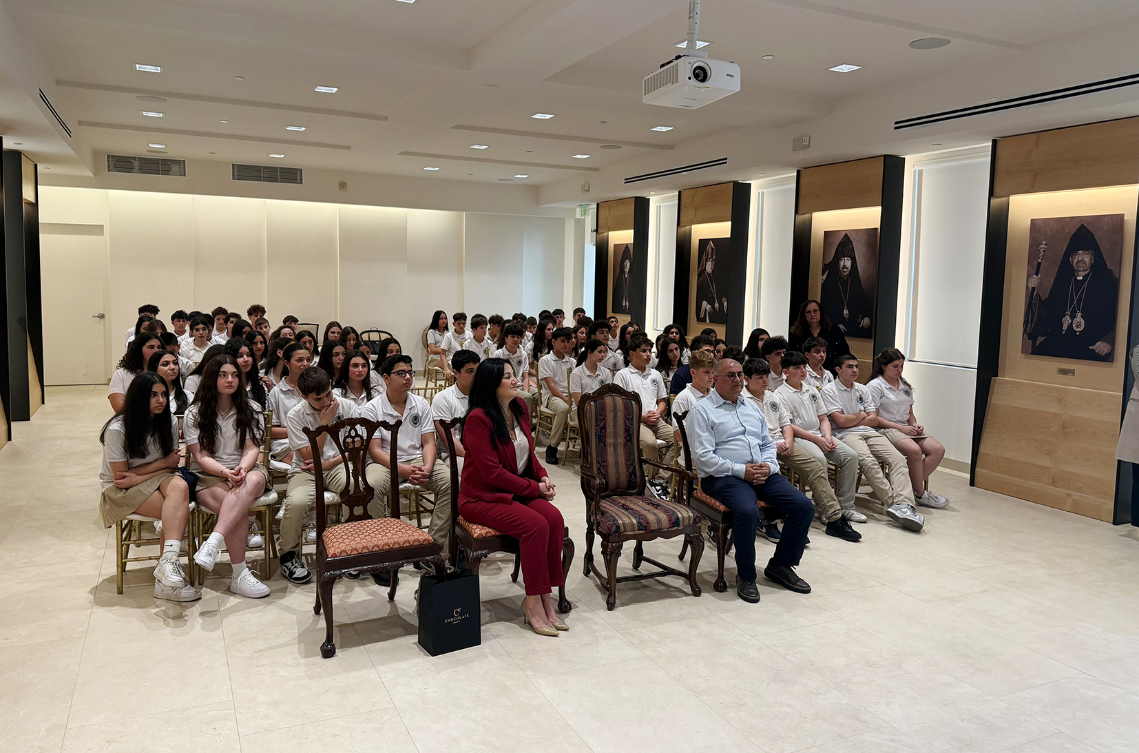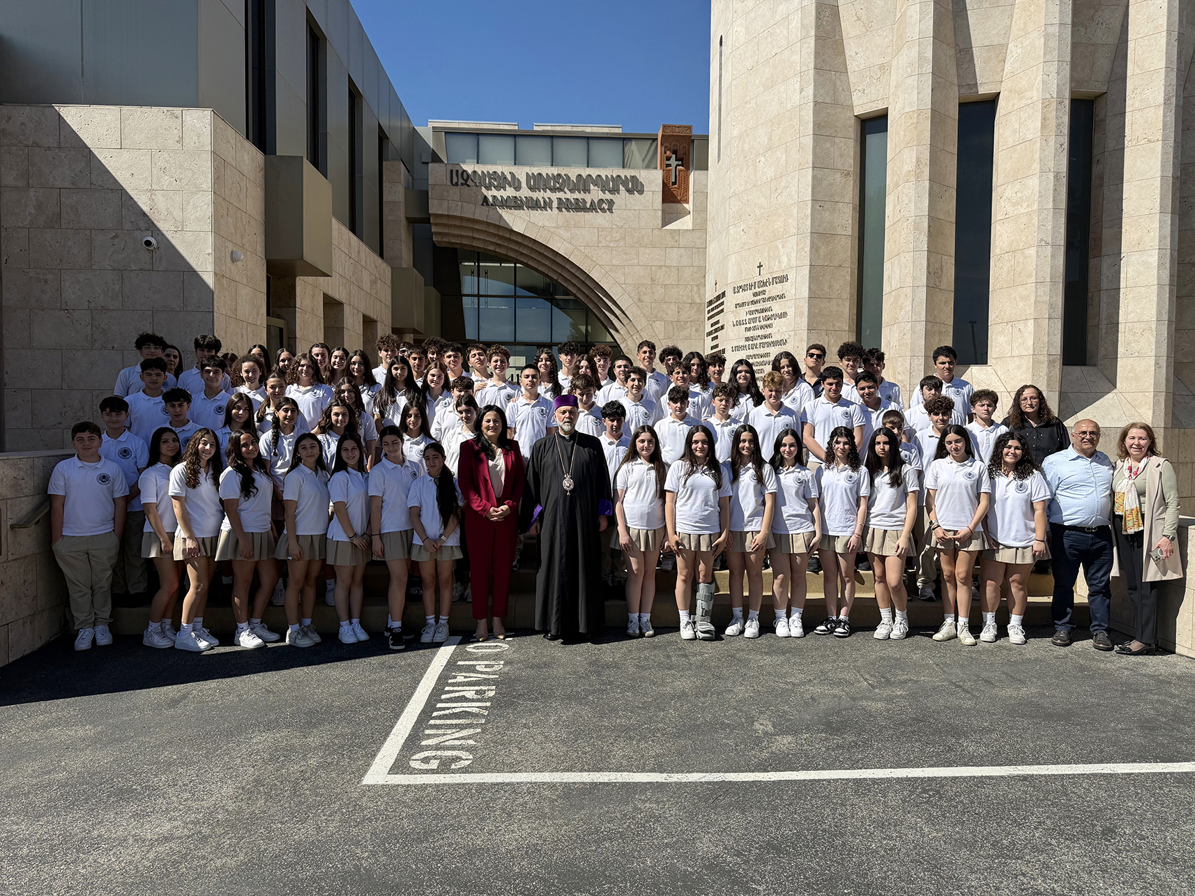 On the morning of Thursday, February 26, 2026, H.E. Archbishop Kegham Khacherian, Prelate of the Western Prelacy of the United States, received approximately 80 eighth grade students from Holy Martyrs Ferrahian Armenian School of Encino at the Dikran and Zarouhi Der Ghazarian Hall of the Western Prelacy. The students were led by the school’s principal, Mrs. Sossi Shanlian, and were accompanied by their teachers and school administrators.