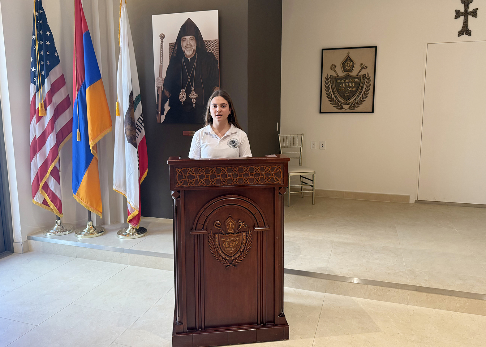 On behalf of the extended family of Holy Martyrs Ferrahian Armenian School, Mrs. Sossi Shanlian delivered heartfelt remarks, congratulating Archbishop Khacherian on the occasion of the Feast of St. Vartanants and expressing her appreciation that, in keeping with tradition, the Prelate once again welcomed the eighth grade students to the headquarters of the Western Prelacy.