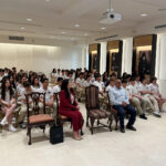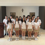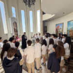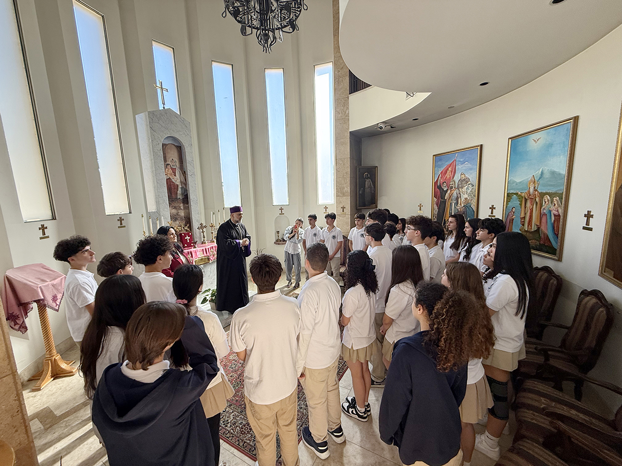 Following the program, the Prelate led the students to the St. Dertad and St. Ashkhen Chapel of the Western Prelacy, where three paintings displayed on the chapel walls depict three key events that reflect the character of Christian Armenia and the Armenian people: the official adoption of Christianity in 301 A.D., the invention of the Armenian alphabet in 405 A.D., and the Battle of Vartanants in 451 A.D., fought in defense of the Christian faith.